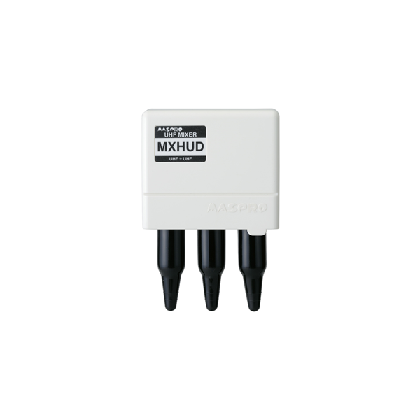 - UHFミキサー(商品名:MXHUD-P)は、地上デジタル放送に対応したUHFブースターに電源を供給できる電流通過機能を内蔵した、UHFとUHFを混合するためのミキサー(混合器)です。